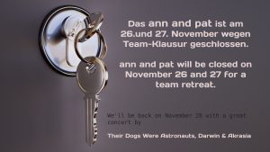 Hallo liebe ALLE, am 26 + 27 November sind wir auf Team-Klausur! Wir überlegen uns ein tolles Programm 2026 für euch! Beste Grüße das ann