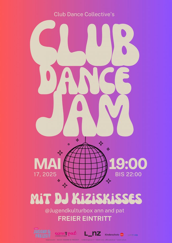 Es ist wieder soweit Clubdance Collective / Waacking Linz laden zum gemeinsamen Dance Jam zu House, Hustle, RNB & Disco Musik ein. Zuerst gibt es ein HUSTLE Intro welches dann in den DANCE JAM übergehen wird. Also packt die Tanzschuhe ein und kommt vorbei! Dieses Mal DJ Kiziskisses an den Turntables Wir freuen uns! https://www.instagram.com/clubdancecollective