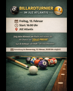 am Freitag, den 13. Februar, findet im Atlantis unser Billardturnier statt. Zeigt euer Können, tretet gegeneinander an und sichert euch den Sieg! Wir freuen uns