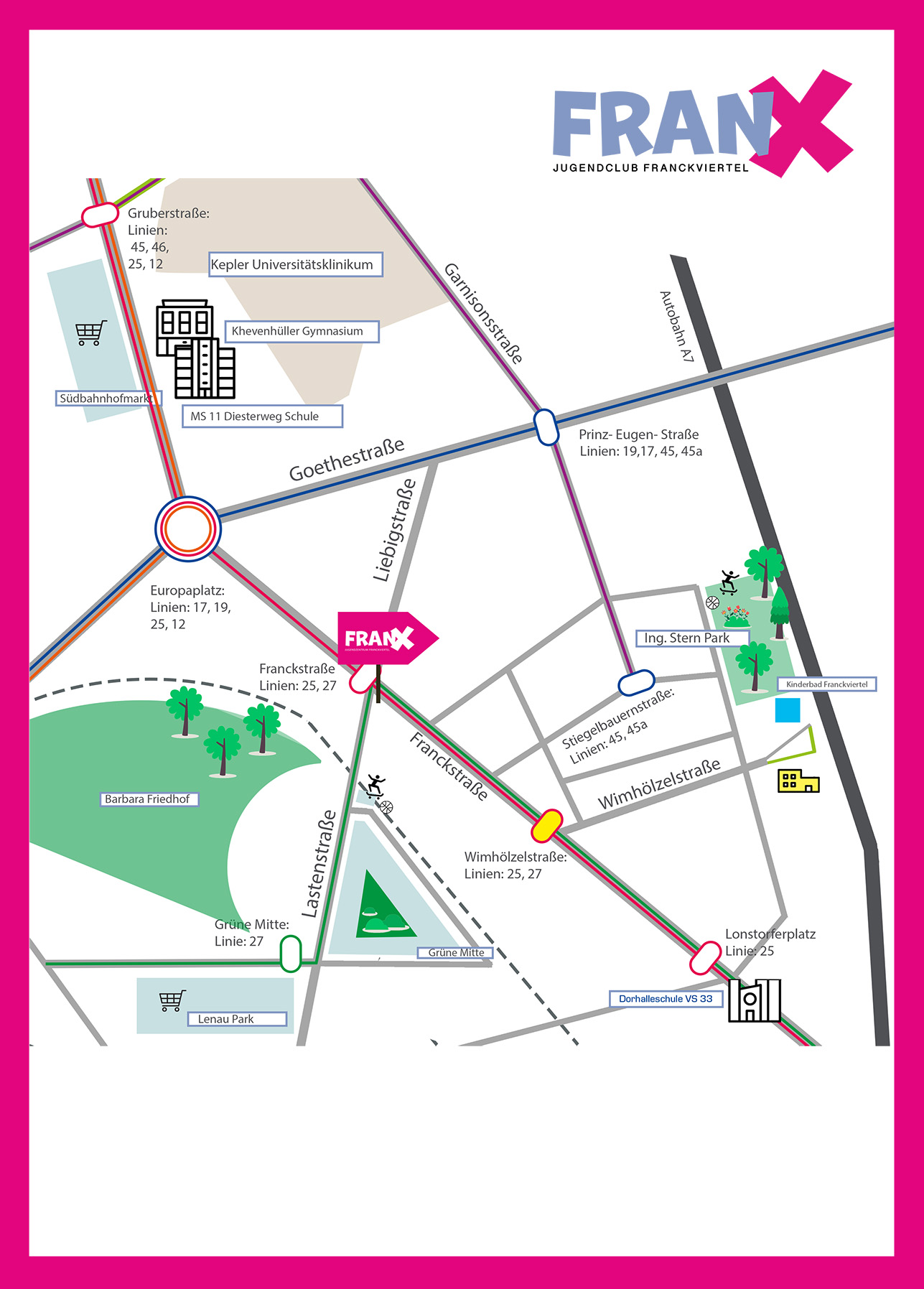 Franckstraße 10/ 4020 Linz. Du kannst uns mit den Linien 27, 25 erreichen Haltestelle: Franckstraße